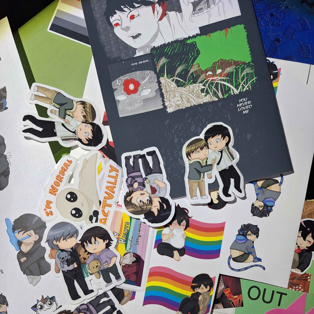 25g of Junk Journaling supplies! Stickers, misprints, cut offs, etc. We want to keep waste low, and as a fellow junk journaler I try to use what I can but there's been times there's too much even for me. If you like my art and want to make a spread with some of it, just need some supplies to boost your current box, or are looking to diversify your journal, this is perfect for you. There may be some pride flag merch in here, so let me know if you have any preferences around that stuff — their inclusion isn't definite.